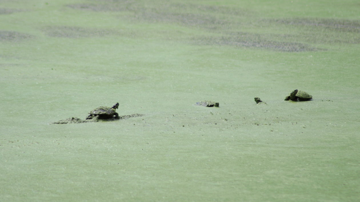 We paused beside a wet swale rife with buttonbush so Donna could photograph basking painted turtles, carapaces green with duckweed. Buttonbush is flood-tolerant but can’t take shade. Elm is one of the few species that can survive the combination.